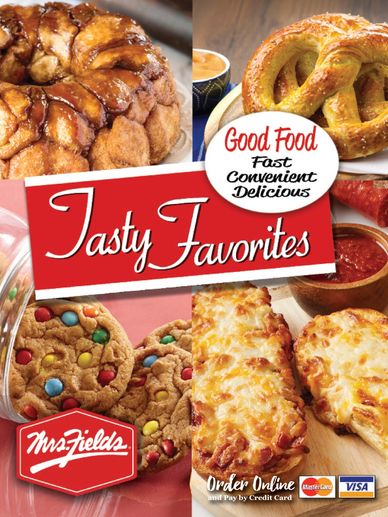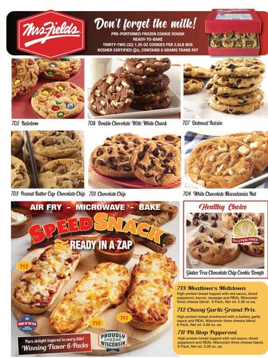 Features Mrs. Fields Cookie Dough and Speed Snack Pizza.